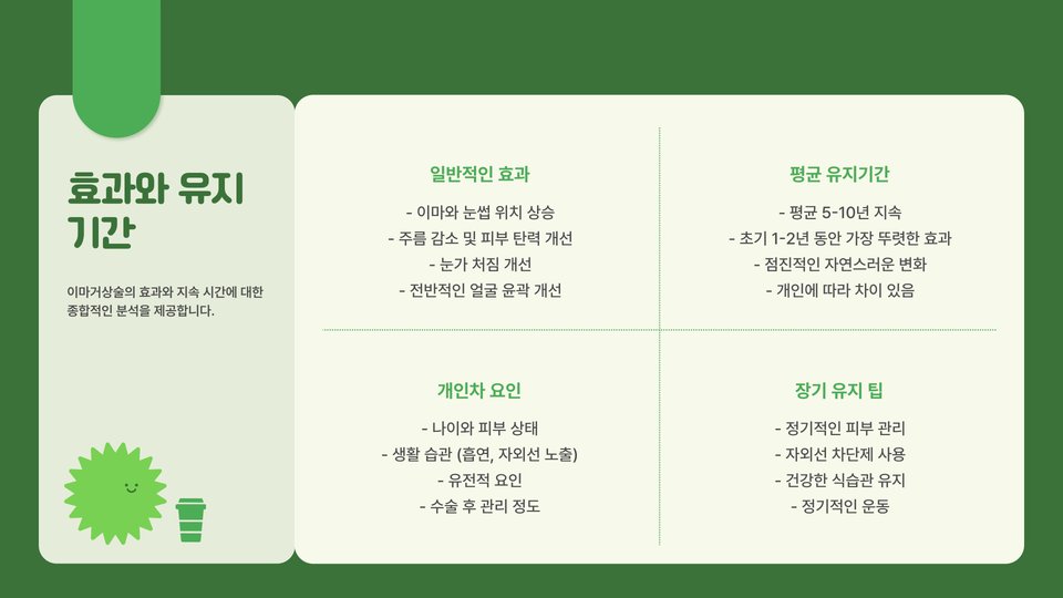 이마거상 수술은 주로 노화의 징후를 개선하는 데 도움을 줍니다. 나이가 들면서 자연스럽게 나타나는 주름이나 처짐은 미적 요소에 큰 영향을 미치기 때문에, 많은 사람들이 이를 해결하기 위해 이마거상을 선택합니다. 이마거상은 시술 후 눈에 띄게 젊어 보이는 효과를 주며, 자신감 향상에도 기여합니다.