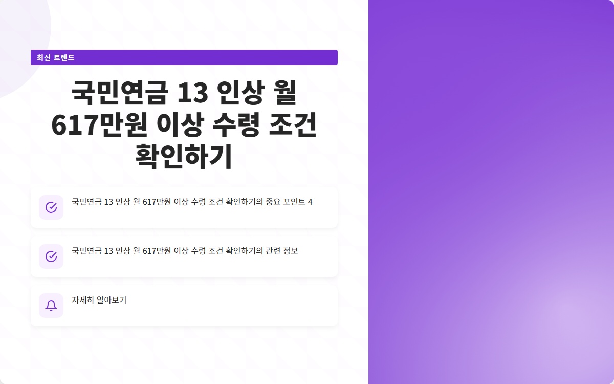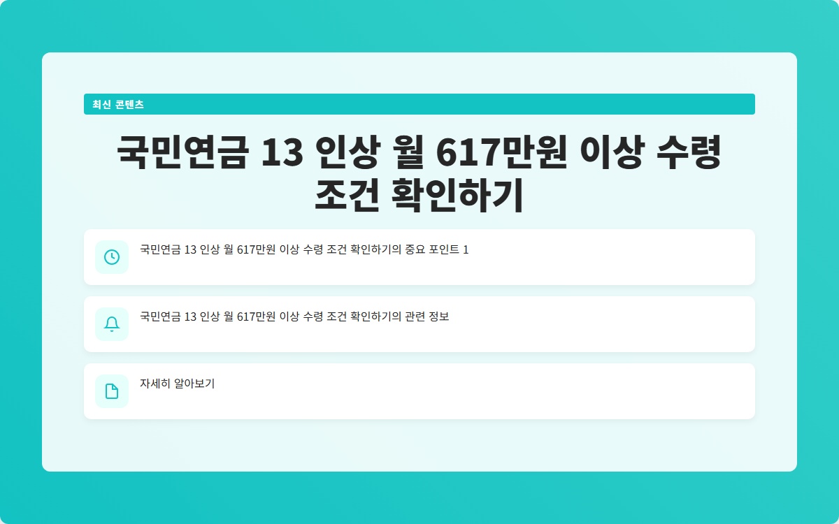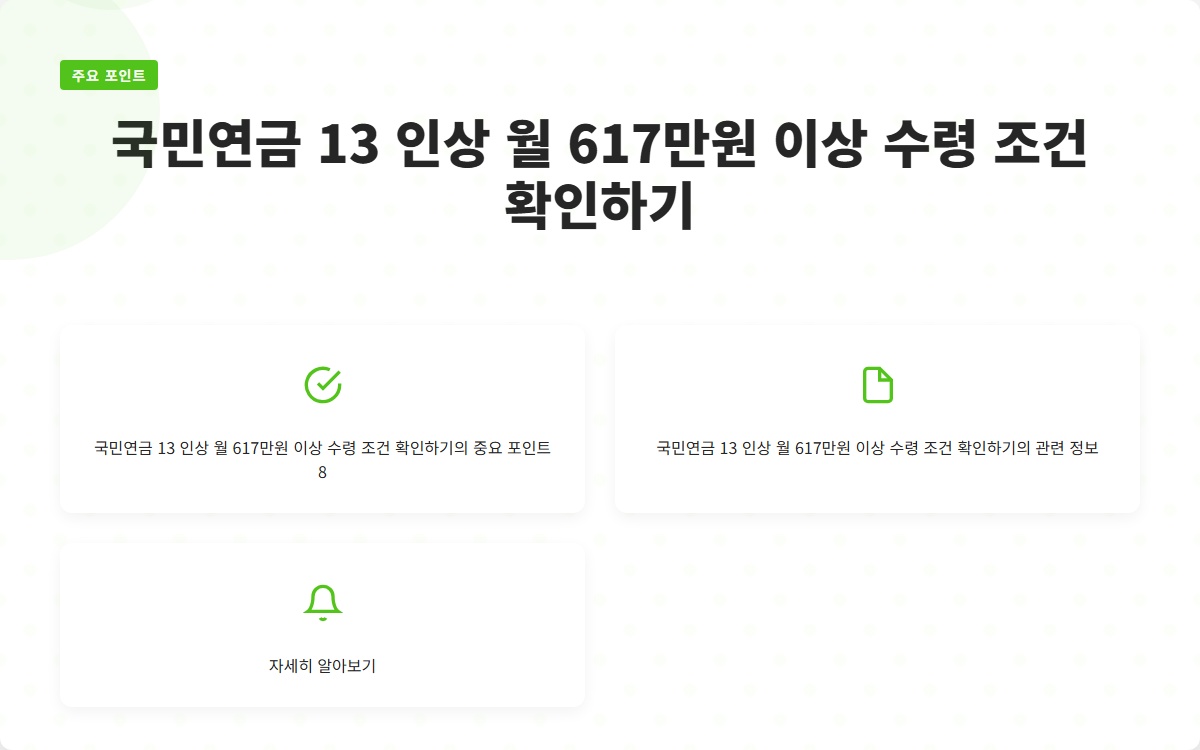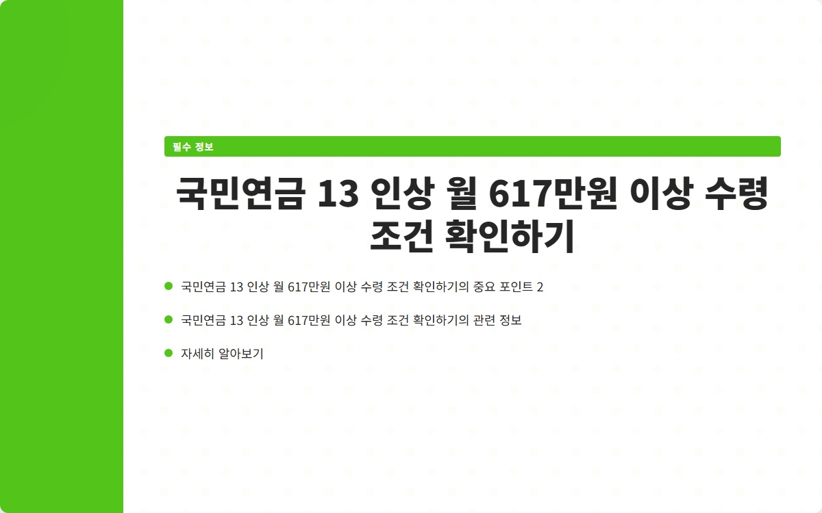 국민연금, 보험료 인상, 13% 인상, 월 617만원, 노후 소득 보장, 재정 안정성, 고갈 시점, 소득대체율, 청년층 불만, 고령화 사회Q. 국민연금 수령액이 617만원 이상이 되려면 어떤 조건이 필요한가요?