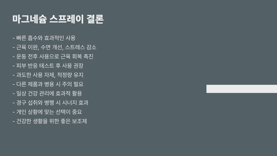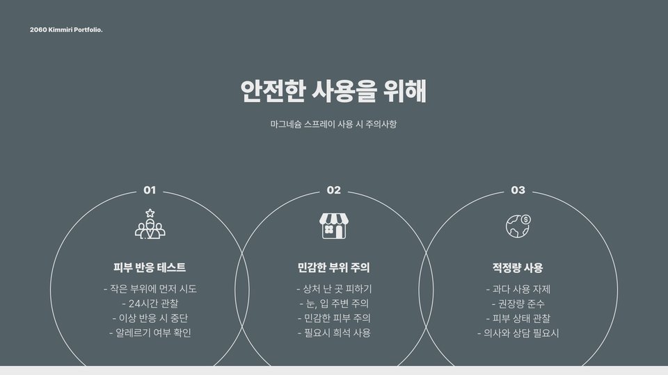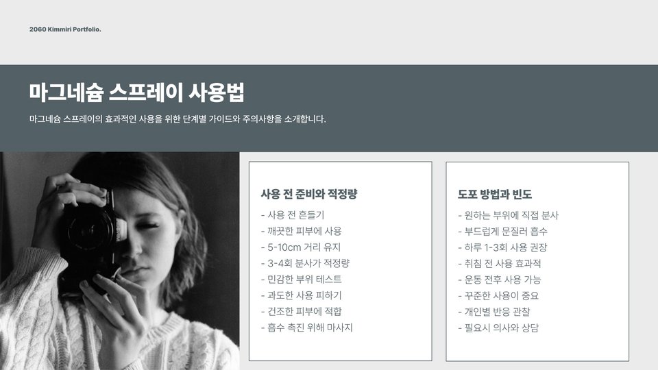 주의사항: 마그네슘 스프레이는 개인의 체질에 따라 다르게 작용할 수 있으니, 처음 사용할 때는 소량으로 테스트 해보는 것이 좋습니다.
