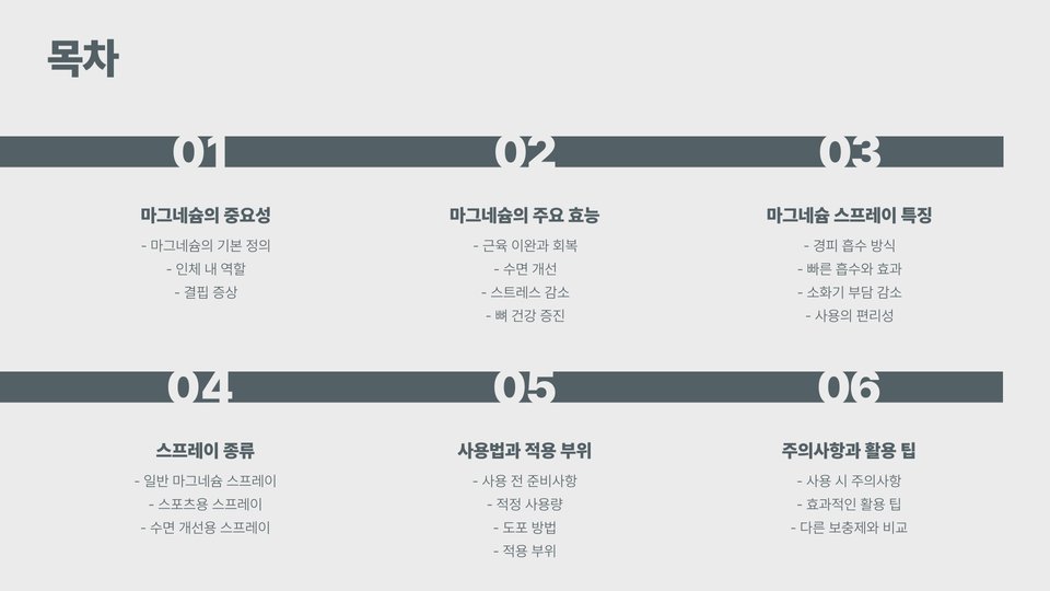 이처럼 마그네슘 스프레이는 다양한 효능을 가지고 있으며, 올바른 사용법을 통해 그 효과를 극대화할 수 있습니다. 건강한 삶을 위해 마그네슘의 효능을 충분히 이해하고 활용해보세요.