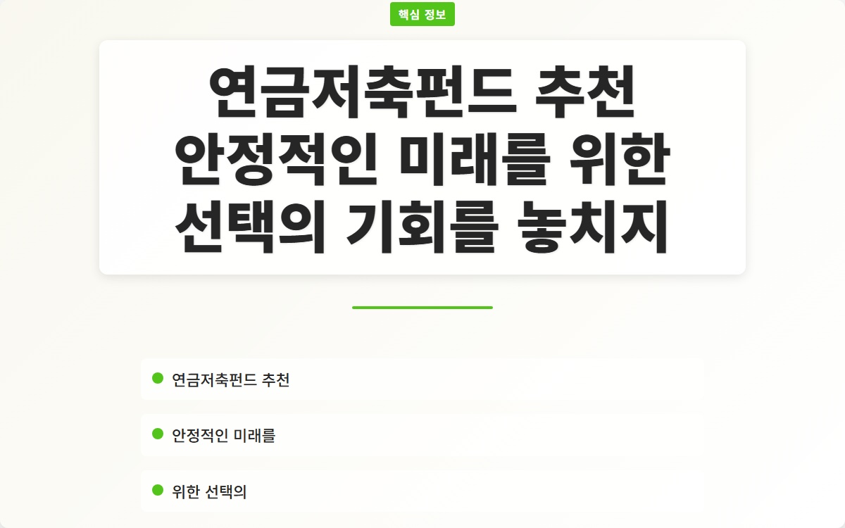 연금저축펀드는 노후 생활을 준비하는 중요한 재정 수단입니다. 오늘날 많은 사람들이 은퇴 후 안정적인 수입원을 필요로 하고 있으며, 이에 따라 연금저축펀드에 대한 관심이 높아지고 있습니다. 이러한 펀드는 장기 투자로써, 특히 세제 혜택과 함께 복리 효과를 누릴 수 있는 기회를 제공합니다. 안정적인 미래를 원하신다면, 연금저축펀드 추천을 통해 최적의 펀드를 찾아보는 것이 중대한 선택이 될 수 있습니다.