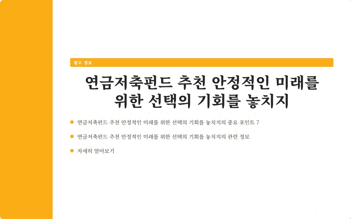 결론적으로, 연금저축펀드 추천은 안정적이고 계획적인 노후 생활을 위한 탁월한 선택이 될 수 있습니다. 각자의 필요와 투자 성향에 맞는 펀드를 선택함으로써, 보다 밝고 안정적인 미래를 준비할 수 있습니다. 따라서, 지금 바로 연금저축펀드에 대한 정보 수집을 시작하고, 전문가의 조언을 통해 올바른 선택을 하기를 권장합니다.