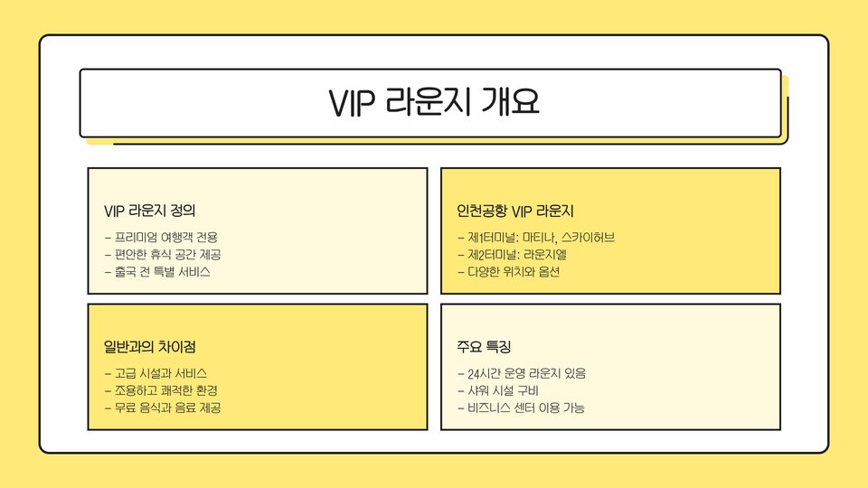 인천공항 VIP 라운지는 여행의 시작과 끝을 더욱 특별하게 만들어주는 공간입니다. 다양한 서비스와 혜택을 통해 더 나은 여행 경험을 제공하며, 고객의 만족도를 높이기 위해 지속적으로 변화하고 있습니다. 여행을 계획할 때, VIP 라운지를 이용해 보시는 것을 추천드립니다.