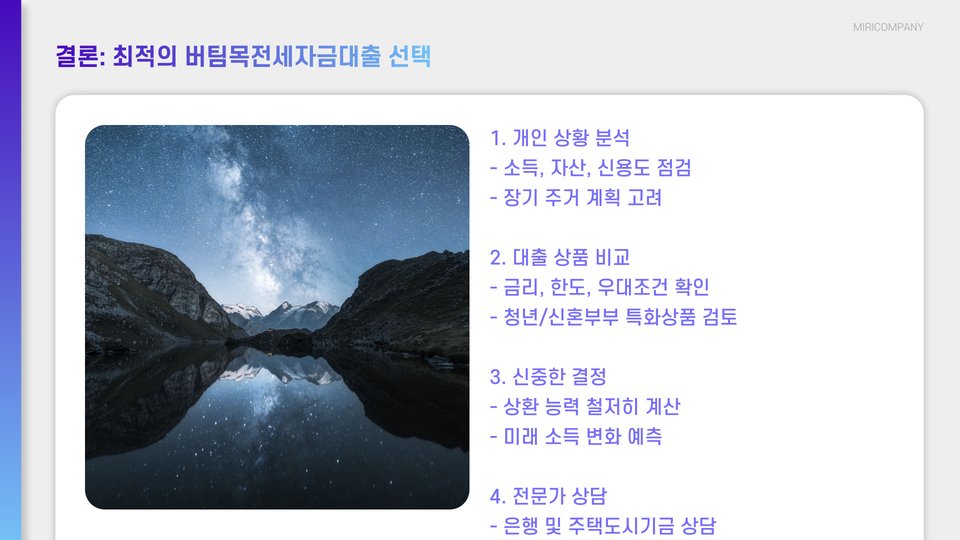 결론적으로, 최신 트렌드에 맞춰 각종 버팀목전세자금대출 상품을 비교 분석하여 자신에게 가장 적합한 선택을 할 수 있도록 노력하는 것이 중요합니다. 경제적 부담을 줄이고 안정적인 주거 공간을 확보하기 위해, 전문가 상담을 통해 다양한 정보를 수집하는 것도 좋은 방법입니다. 이러한 노력들이 모여 자신에게 가장 유리한 선택으로 이어질 수 있습니다.