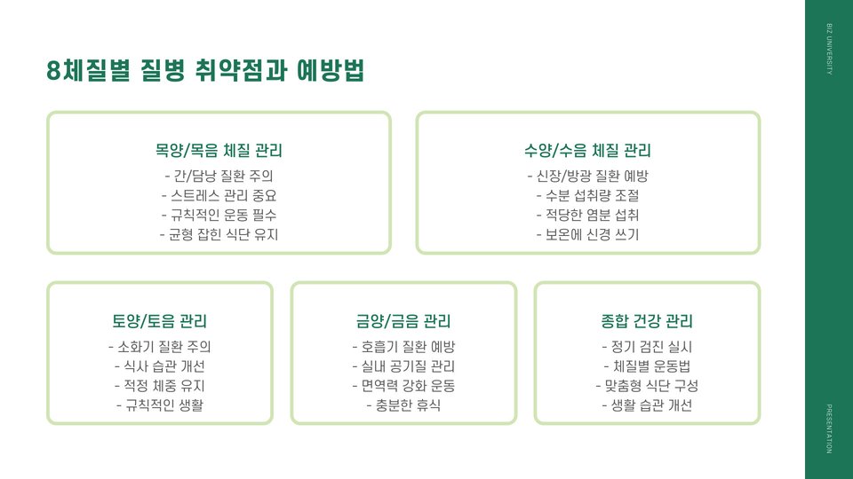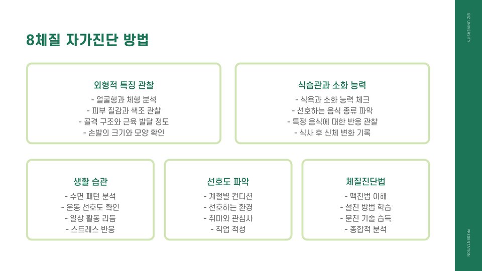 - 자가진단을 통해 8체질을 파악하자: 자신의 체질을 이해하고 건강을 챙길 수 있는 기회를 갖자.