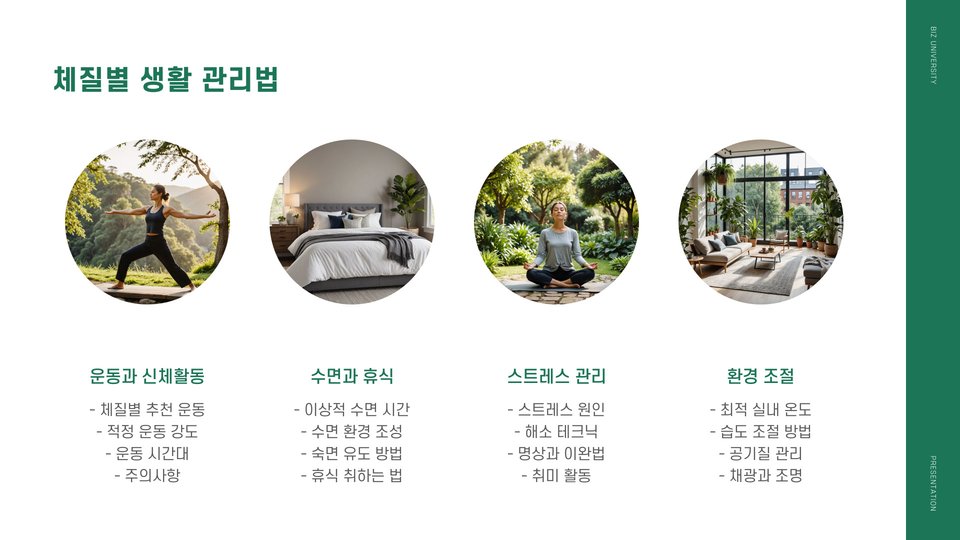 이 가이드를 통해 8체질에 대한 이해를 높이고, 건강한 삶을 위한 첫걸음을 내딛기를 바랍니다. 자가진단을 통해 자신에게 적합한 체질을 파악하고, 이를 바탕으로 건강한 식습관을 형성해 나가세요!
