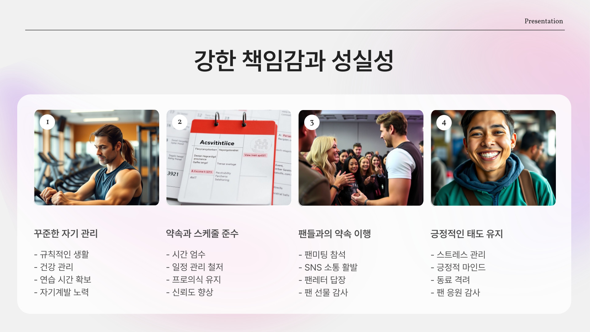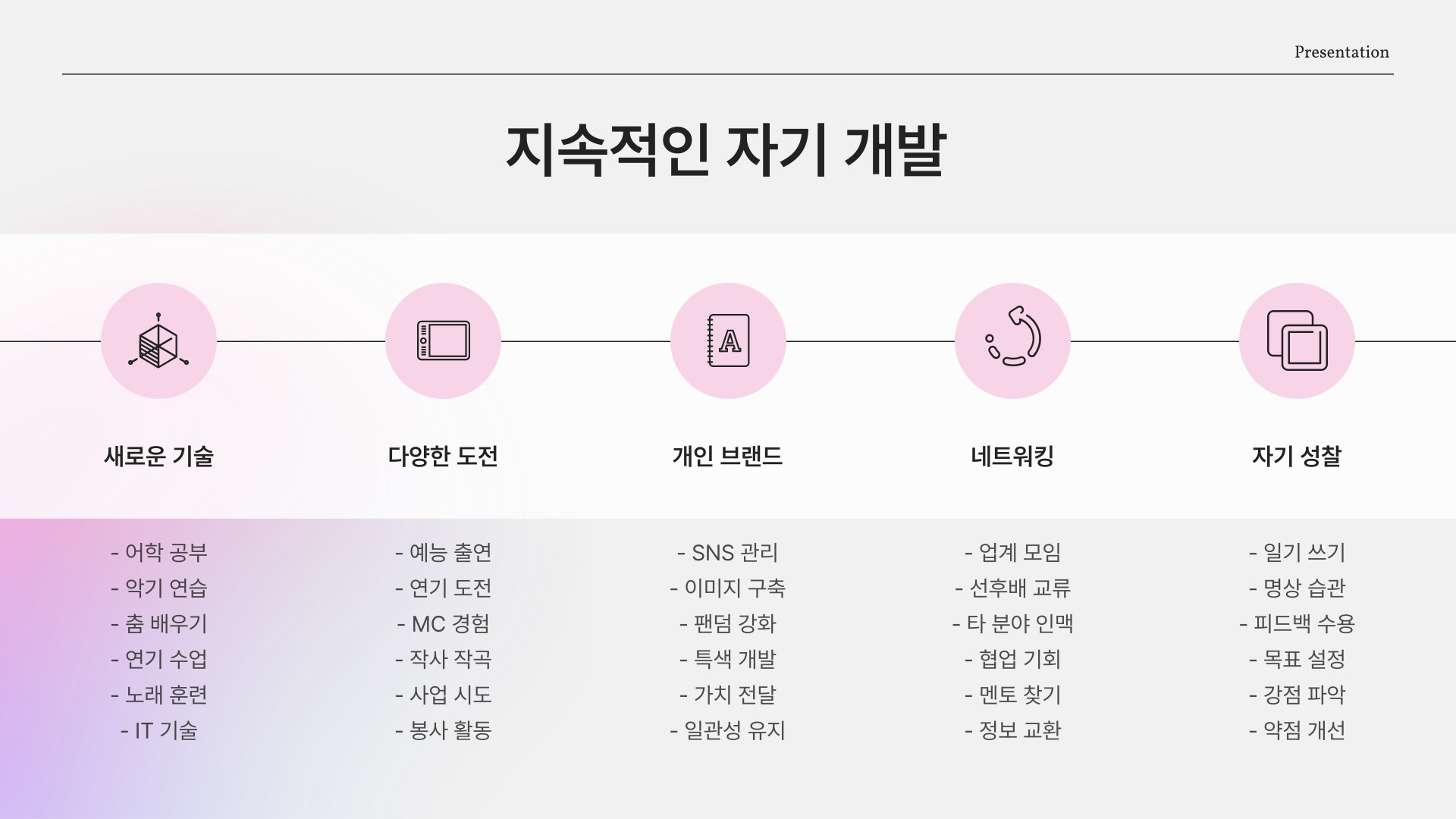 - 2. 꾸준한 노력: 항상 자기 계발에 힘쓰며, 새로운 기술을 배우는 데 열중합니다.