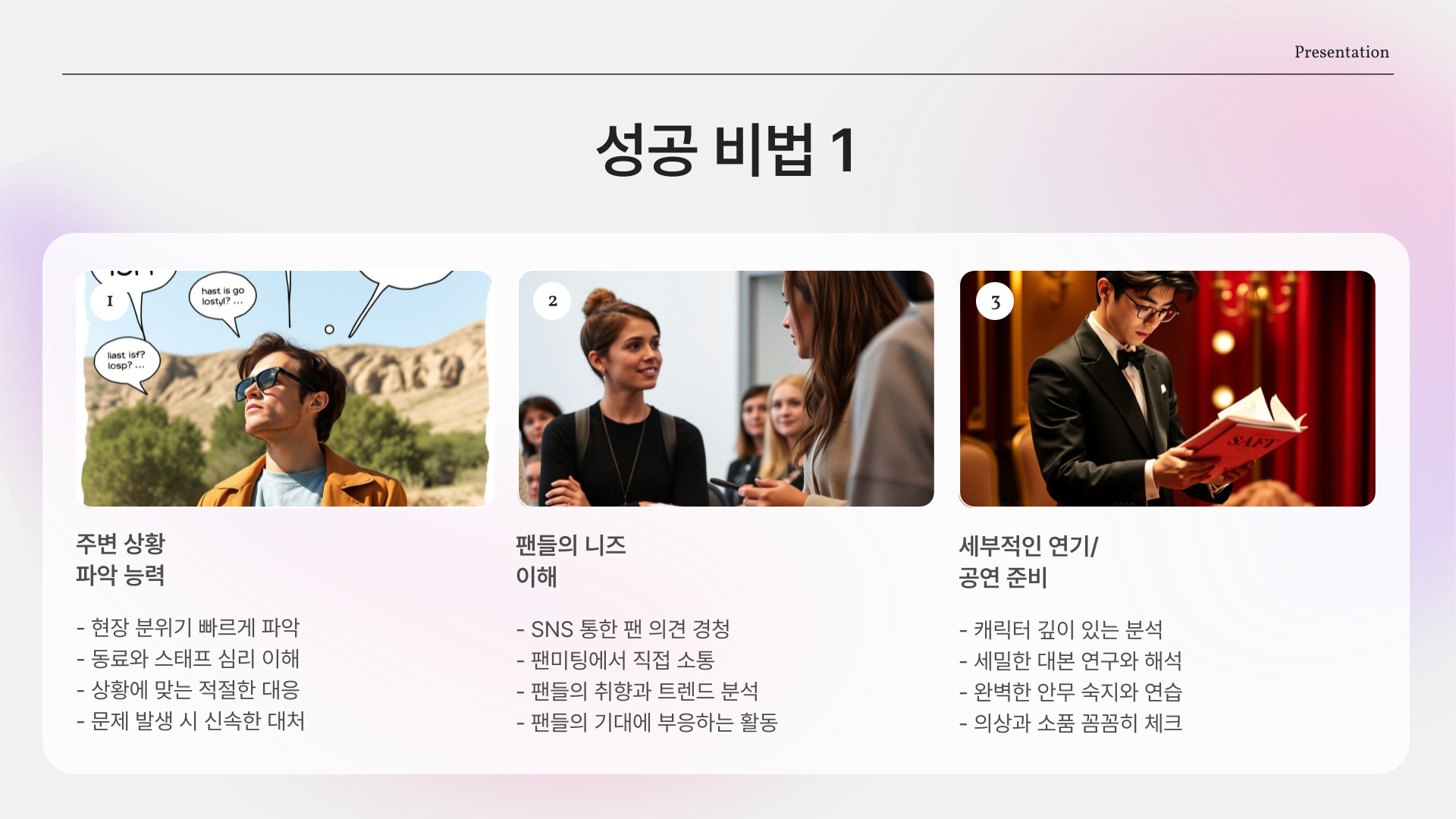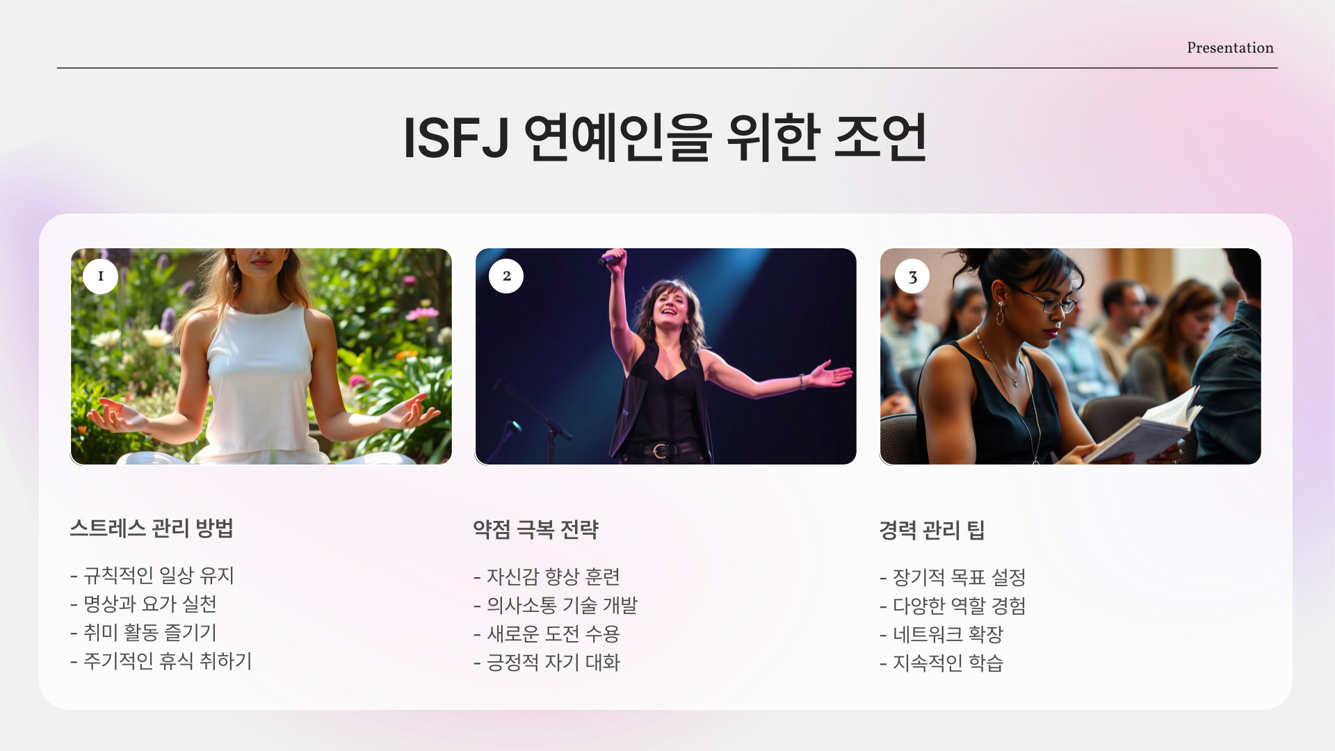 두 번째 비법은 신중함과 실용성입니다. ISFJ 연예인들은 상황을 잘 분석하고, 어떤 행동이 적절할지를 고민합니다. 이는 그들이 실수 없이 프로페셔널하게 작업을 진행할 수 있도록 해줍니다. 소녀시대의 태연이 노래를 부를 때마다 느껴지는 감정 표현은 신중함의 결과라고 할 수 있습니다.