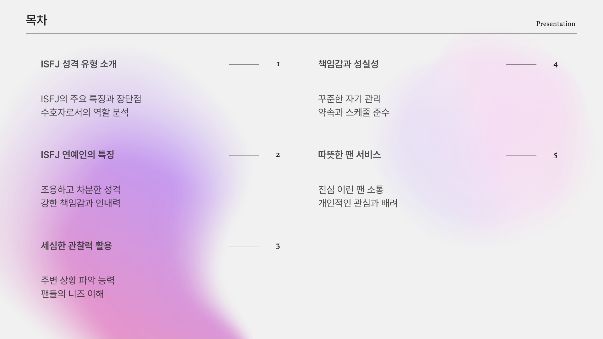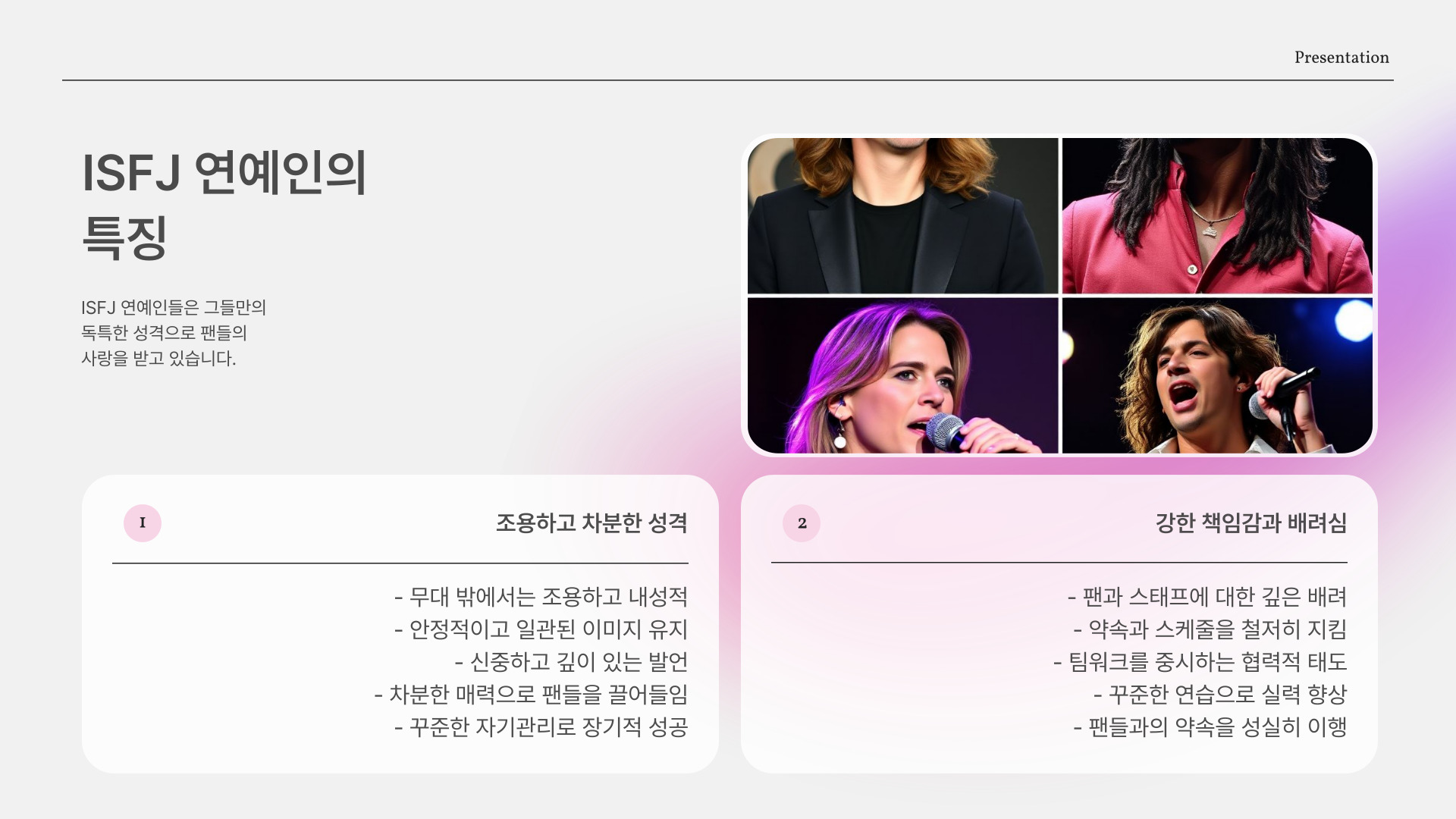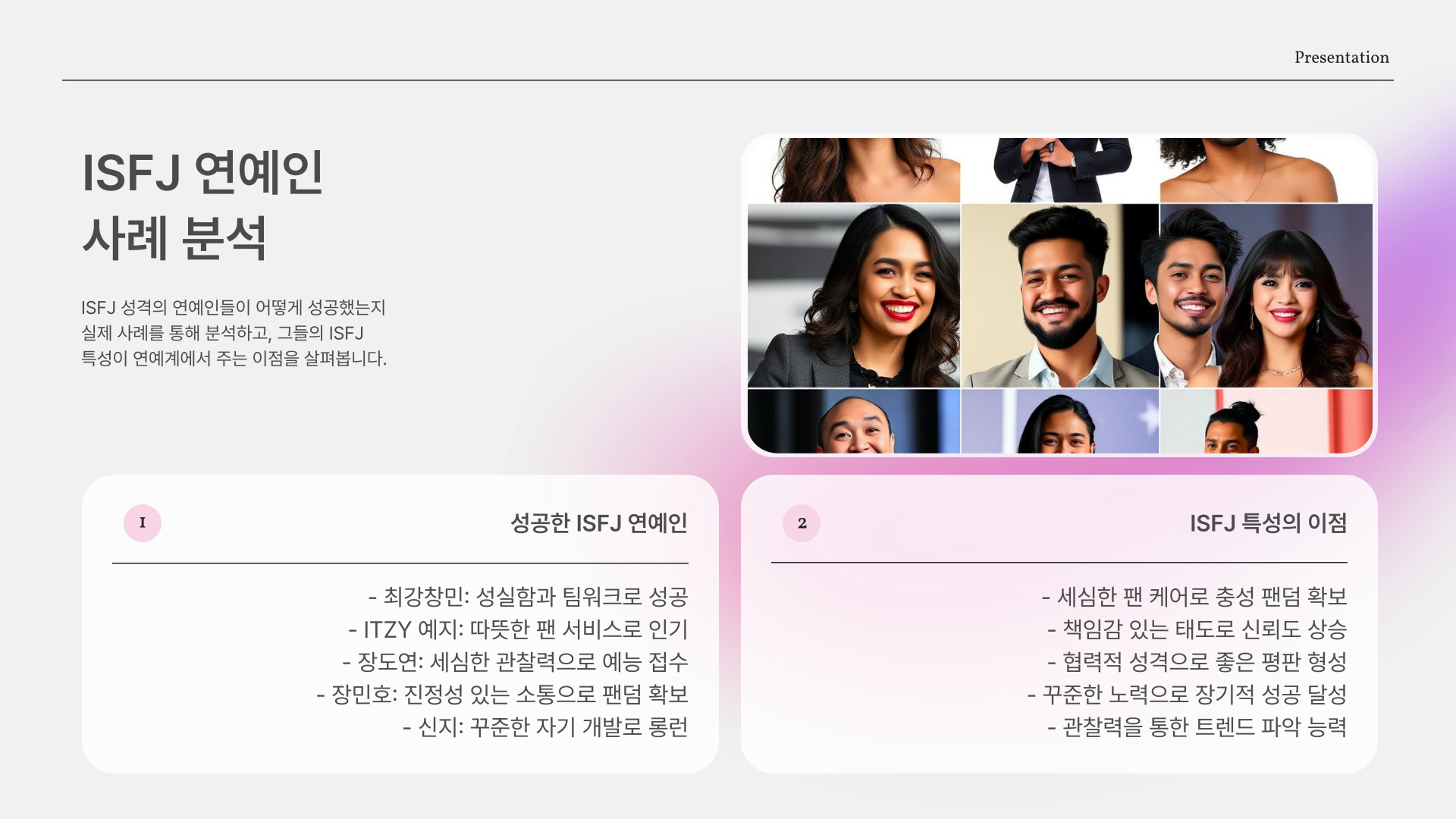 - ISFJ들은 배려와 신중함으로 사랑받는 연예인입니다.