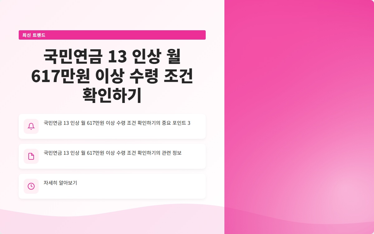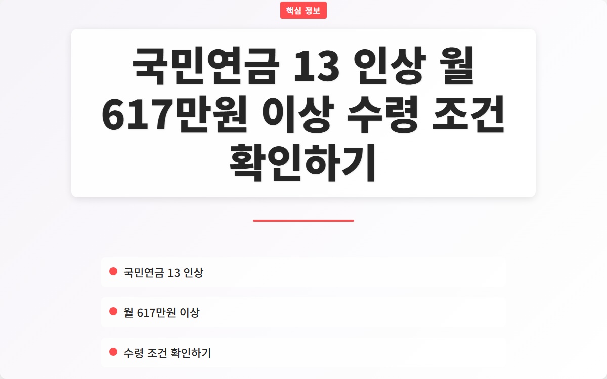 국민연금, 보험료 인상, 13% 인상, 월 617만원, 노후 소득 보장, 재정 안정성, 고갈 시점, 소득대체율, 청년층 불만, 고령화 사회Q. 국민연금 수령액이 617만원 이상이 되려면 어떤 조건이 필요한가요?