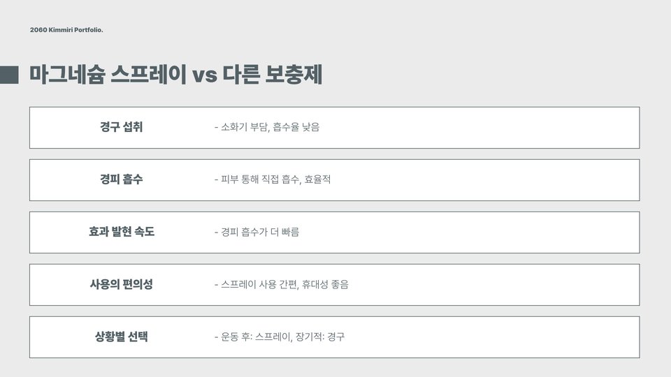 마그네슘 스프레이는 최근에 많은 인기를 얻고 있습니다. 그 이유는 사용이 간편하고, 피부를 통해 직접 흡수되기 때문입니다. 스프레이 형태로 제공되어, 언제 어디서나 쉽게 사용할 수 있는 점이 매력적입니다. 또한, 마그네슘 스프레이는 빠르게 흡수되어 즉각적인 효과를 볼 수 있습니다. 운동 후 뭉친 근육에 직접 뿌리면, 통증이 완화되는 것을 느낄 수 있습니다. 이는 특히 운동량이 많은 사람들에게 큰 도움이 됩니다.
