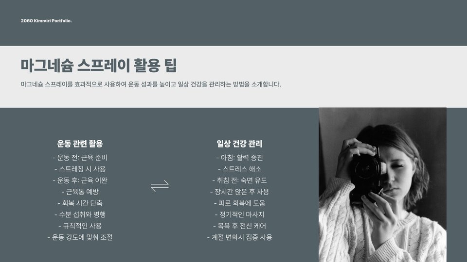 주의사항: 마그네슘 스프레이는 개인의 체질에 따라 다르게 작용할 수 있으니, 처음 사용할 때는 소량으로 테스트 해보는 것이 좋습니다.