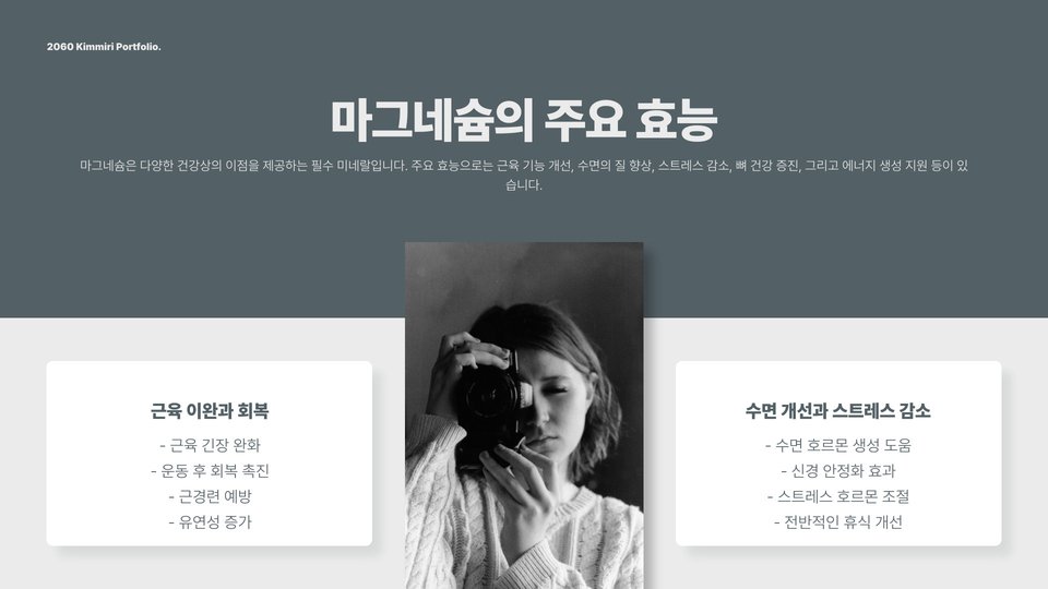 - 마그네슘은 근육 이완과 스트레스 감소에 효과적입니다.