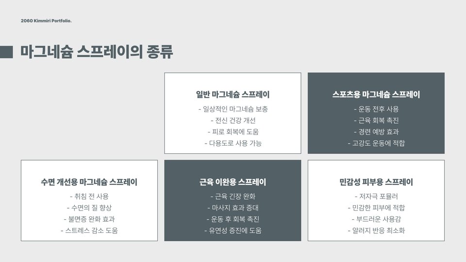 이처럼 마그네슘 스프레이는 다양한 효능을 가지고 있으며, 올바른 사용법을 통해 그 효과를 극대화할 수 있습니다. 건강한 삶을 위해 마그네슘의 효능을 충분히 이해하고 활용해보세요.