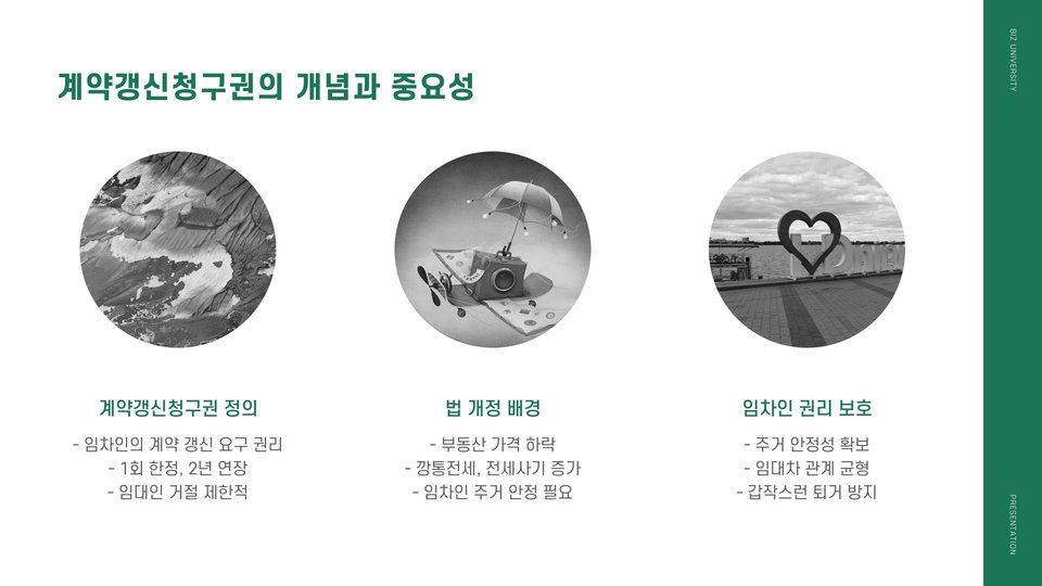 또한, 사회문제로 대두되고 있는 세입자와 임대인 간의 갈등이 이러한 갱신청구권의 강화로 이어지고 있습니다. 우리는 이제 더 나은 협상 조건을 통해 서로 상생할 수 있는 방향으로 나아가야 합니다. 이를 위해서는 미리 갈등을 예방하는 방안이 필요합니다.