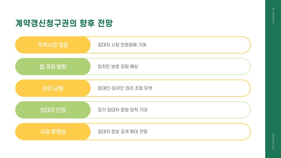 앞으로의 월세계약 갱신청구권에 대한 전망은 긍정적입니다. 정부는 임차인의 권리를 보호하기 위한 다양한 정책을 시행하고 있으며, 사회적 인식도 점차 개선되고 있습니다.
