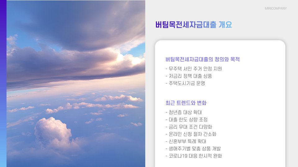 - 버팀목전세자금대출은 주택도시기금에서 지원하는 안전한 대출 상품입니다.